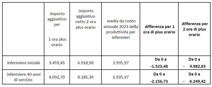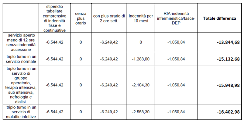 Lo studio ricorda poi come le varie riforme negli anni abbiano inciso sui diversi istituti stipendiali integrativi. «Ancora una volta – sottolinea Bottega – il risultato è penalizzante per gli infermieri». Tra queste voci, ad esempio, figura il plus orario che negli anni è stato sostituto con il Fondo per la produttività. «Un passaggio per nulla indolore per le tasche dei professionisti: nel caso di un infermiere neoassunto la perdita economica per un’ora di lavoro aggiuntivo a settimana supera i 1.500 euro annui di stipendio, per due ore aggiuntive settimanali i 5mila euro. Nel caso invece di un infermiere con 40 anni di servizio queste cifre diventano rispettivamente oltre 2.150 e oltre 6.200 euro annui di perdita (Tabella 6)».