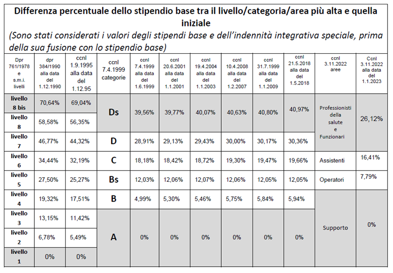 In sostanza, considerando un ex livello 6 neoassunto, “tra il 1990 e oggi un infermiere ha perso 1.135 euro come stipendio base e 1.320 alla luce delle altre voci del trattamento fondamentale, per un totale di quasi 2.500 euro (Tabella 4).